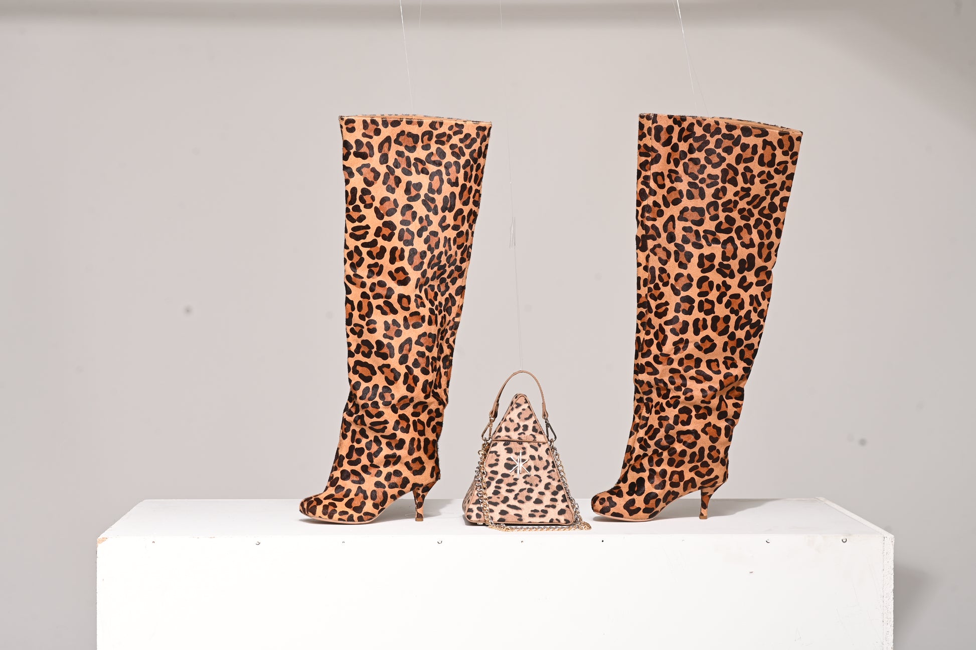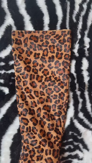 Introducing our stunning thigh-high leopard pony hair boots, designed to make a bold fashion statement. Crafted from luxurious pony hair, these boots feature a striking leopard print that adds a touch of wild elegance to any outfit. The 1-inch heel provides the perfect balance of comfort and style, making them ideal for both day and night wear. With a sleek silhouette that. An be work slouched, hugs the thigh or relaxed fit . These boots are not only fashionable but also incredibly versatile. Pair them with a fitted dress or your favorite denim for an effortlessly chic look. Step out in confidence and let your style roar!